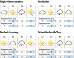 Der Samstag beginnt zunächst kühl und bewölkt, gegen Mittag zeigt sich zunehmend die Sonne und die Temperaturen steigen auf 23 °C im nördlichen Rheintal und im mittleren Neckarraum, 22 °C am Bodensee und 20 °C auf der Alb. Am Sonntag wird es weitgehend sonnig, örtlich bilden sich leichte Quellwolken bei weiter steigenden Temperaturen bis zu 27 °C im nördlichen Rheintal, 26°C im mittleren Neckarraum, am Bodensee und auf der Alb. Am Montag steigen die Temperaturen auf bis zu 30 °C in den Ebenen und 26 °C auf der Alb, gegen Abend ist mit lokalen Hitzegewittern zu rechnen. Zum Dienstag ziehen mit Wind aus nordwestlichen Richtungen neue Wolken auf, die für kühlere Temperaturen sorgen. In den Folgetagen bleibt es voraussichtlich beständig und...
