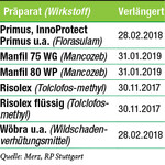 Das Bundesamt für Verbraucherschutz und Lebensmittelsicherheit (BVL) hat die Zulassung von Pflanzenschutzmitteln, deren Zulassung durch Zeitablauf endete, verlängert. Diese Zulassungsverlängerungen werden bis zur endgültigen Entscheidung über eine erneute Zulassung erteilt. →Mehr Hinweise zur aktuellen Befallssituation von Pflanzen und Schädlingen finden Sie auf www.bwagrar.de/Pflanzenbau/Ackerbau