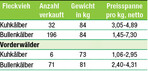 Am 8. Juni 2017 standen bei der Auktion der RBW 307 Kälber zum Verkauf. Bei sehr starker Nachfrage verbesserten sich die Preise in allen Gattungen. Die sechs Vorderwälder-Kuhkälber fanden sehr flott neue Besitzer. Sie kamen auf einen Durchschnittspreis von 160 Euro bei 70 kg Gewicht. Die 32 Fleckvieh-Kuhkälber konnten die Nachfrage nicht ganz decken. Mit 84 kg Durchschnittsgewicht erzielten sie einen Preis von 354 Euro. Dies ergibt im Schnitt 4,21 Euro je kg. Am gefragtesten waren eine Humpert-Tochter von der Rogg GbR in Stühlingen-Bettmaringen und eine Mupfel P-Tochter von Kaiser Joachim in Klettgau-Bühl. Die 71 Vorderwälder-Bullenkälber wogen im Schnitt 81 kg . Je Kalb wurde netto 303 Euro angelegt. Der Kiloreis belief sich somit auf...