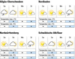 Der Samstag beginnt teils bewölkt, bei Minima um 15 °C in den Ebenen und 12 °C in Hochlagen, dann lockert mäßig böiger Wind aus westlichen Richtungen die Bewölkung und hebt die Temperaturen bis 25 °C im nördlichen Rheintal, im mittleren Neckarraum und am Bodensee und 20 °C auf der Alb, vereinzelt gibt es Gewitter. Der Sonntag wird nach Auflösung von dichteren Wolkenfeldern zunehmend sonnig, bei leicht zurückgehenden Temperaturen. Am Montag hebt die Sonne die Temperaturen bis 28 °C im nördlichen Rheintal, im mittleren Neckarraum und am Bodensee und 24 °C auf der Alb, vereinzelt gibt es Gewitter. Am Dienstag werden über 30 °C erreicht, dann bringt frischer Wind aus südlichen Richtungen Wolken und teils heftige Gewitter mit flächendeckendem...