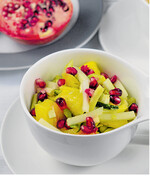 240 g geschälter Kohlrabi 150 g Zucchini 130 g geschälte Sellerie 1 Avocado 1 Ananas ½ Granatapfel Saft von ½ Zitrone Für die Soße: 3 EL Distel- oder Olivenöl, 1 TL Zucker oder 1 EL Ahornsirup, 1 TL Salz, gemahlener, schwarzer Pfeffer