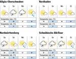 Der Samstag beginnt meist klar bei minimal 20°C in den Flussebenen, dann bringt auffrischender Wind aus westlichen Richtungen zunehmend Wolken und gewittrige Schauer bei maximal 30°C im Rheintal und am Bodensee und 25°C auf der Alb. In der Nacht auf Sonntag ziehen die Gewitter ab, im Breisgau bleibt es tropisch, dann bringt frischer Wind aus Westen weitere Regenschauer bei Temperaturen bis 26°C im nördlichen Rheintal, mittleren Neckarraum und am Bodensee und 22°C auf der Alb. Am Montag bringt Westwind klare Abschnitte, Wolken und Schauer bei leicht steigenden Temperaturen. Am Dienstag und in den Folgetagen gehen die Temperaturen und Schauerneigung voraussichtlich leicht zurück. | →Das detaillierte Agrarwetter für Ihren Ort und Ihre...