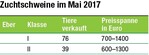 Der Schweinemarkt zeigte im Mai eine weiterhin freundliche Stimmung mit stabilen Preisen. Eine gute Nachfrage im Export, in der Ferkelerzeugung und der Besamung, sowie ein sehr hochwertiges Angebot der Zuchtbetriebe steigerten die Verkaufszahlen der Eber im Mai im Vergleich zum Vormonat. Insgesamt verkauften die badenwürttembergischen Züchtern 115 Jungeber zum Durchschnittpreis von 1130 Euro. Knapp die Hälfte der Tiere ging in andere Bundesländer und ins europäische Ausland nach Spanien (40 Stück) und Griechenland (12 Stück). In Klasse I standen 79 Tiere, zumeist genomisch typisiert, stressnegativ und mit hohen und gesicherten genomischen Zuchtwerten. Im Mai wurden relativ wenige Eber der Deutschen Landrasse vermarktet. Spitzeneber kamen...