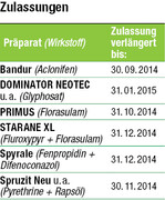 Die Zulassung vonRevus (Wirkstoff: Mandipropamid) wurde nach Art. 51 um folgendes Anwendungsgebiet erweitert: Gegen Falschen Mehltau in Spinat im Freiland mit 0,6 l/ha in 300 bis 600 l Wasser/ha. Maximal zwei Anwendungen im Abstand von sieben bis zehn Tagen. Wartezeit: sieben Tage. Movento OD 150 (Wirkstoff: Spirotetramat) ist zusätzlich nach Art. 51 zugelassen zur Bekämpfung von Blattläusen in Blumenkohlen und Weißer Fliege in Blumenkohlen, Blattkohlen, Kohlrabi und Kopfkohl (Rot-, Weiß-, Spitz- und Wirsingkohl) im Freiland mit 0,48 l/ha in 300 bis 600 l Wasser/ha. Maximal zwei, in Blattkohlen maximal drei Anwendungen im Abstand von mindestens 14 Tagen. Wartezeit: drei Tage. Das Bundesamt für Verbraucherschutz und Lebensmittelsicherheit...