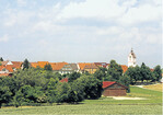 Benzingen, Gemeinde Winterlingern im Zollernalbkreis. Die Ortschaft liegt an der B436 zwischen Albstadt und Sigmaringen. Auf dem Bild ist rechts die Katholische Pfarrkirche St. Peter und Paul zu sehen. Der Chor stammt aus dem 12. Jahrhundert, der Turm mit Staffelgiebel wurde 1688 erbaut. Zwischen 1917 und 1924 besuchte Albert Einstein mehrmals seinen Freund Pfarrer Camillo Brandhuber im Pfarrhaus. Eine Gedenktafel erinnert daran. Wahrzeichen der Ortschaft ist der 1923 erbaute Wasserturm. Bei klarem Wetter kann man von oben die Alpen sehen. |