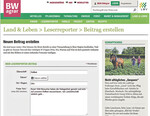 Liebe Leserinnen und Leser: Ihr Blick aufs Land ist gefragt. Werden Sie BWagrar Leserreporter und berichten Sie mit Text und Bild von Veranstaltungen in Ihrer Region. Es ist ganz einfach: Gehen Sie ins Internet auf die Seite www.bwagrar.de. Unter der Rubrik Land&Leben finden Sie die „Leserreporter". Ein Mausklick auf den rechten Button und Sie haben die Möglichkeit in ein paar Zeilen Ihre Veranstaltung zu beschreiben. Anschließend laden Sie noch die Bilder hoch – fertig! So können Sie alle am Hoffest, der Zuchtschau oder der Landjugendparty teilhaben lassen und bekommen gleichzeitig eine Plattform, wo Besucher die Bilder kinderleicht anschauen können. Probieren Sie es aus!