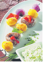 500 g kleine, runde Kartoffeln 500 g Schweinsbratwürste 1/2 grüne Paprikaschote 1/2 rote Paprikaschote 4 rote Zwiebeln Salz, weißer Pfeffer, Paprikapulver 125 ml Sonnenblumenöl 250 g Magerquark 2 EL Sonnenblumenöl 1 Frühlingszwiebel 1/2 Bund Schnittlauch 1 Zwiebel 1 TL Kümmel