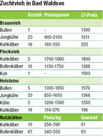 Bei der RBW-Auktion am 9. Juli gab es gute Einkaufsmöglichkeiten für die Käufer. Braunvieh: Körsieger der Bullen war ein Payssli-Sohn aus der Zucht von Familie Heckenberger. Teuerster Bulle war der Reservesieger, ein Viff-Sohn aus einer Ellection-Mutter. Er erlöste 1300 Euro. Sehr gefragt waren die Jungkühe. Drei erlösten über 2000 Euro. Dies waren eine Easten-Tochter aus dem Betrieb Karl Baisch, Barabein, sowie zwei Jungkühe aus dem Betrieb Robert Schwarz, Bienzen. Eine Vasir-Tochter mit 38,7 kg Milch und eine Huray-Tochter mit 36,2 kg zeigten das Spitzenniveau beim Braunvieh. Die Zuchtkälber wurden flott verkauft. Fleckvieh: Gefragt waren die beiden Bullen. Mit 1900 Euro war der Körsieger der teuerste Bulle vom Betrieb Alois Müller,...