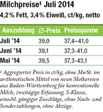In Baden-Württemberg konnten die Milchauszahlungspreise im Juli mit 39,02 Cent pro kg auf dem Niveau des Vormonates Juni gehalten werden. Wie es jetzt im zweiten Halbjahr mit den Milchpreisen weitergeht, vermag derzeit keiner seriös vorauszusagen. Dazu gibt es zu viele Unsicherheiten. Die Chancen für Preiserhöhungen scheinen insgesamt gering, nachdem im Norden die Preise bereits um ein bis zwei Cent gefallen sind. Sorgen bereiten eine zu starke weltweite Milchproduktion. So haben die USA ihre Magermilchexporte im ersten Halbjahr 2014 um über 13 Prozent erhöht. Die neuseeländische Molkereigenossenschaft Fonterra hat ihren Vorauszahlungspreis um 14 Prozent gesenkt, nach dem die Notierungen auf der Handelsplattform Global Dairy Trade...