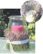 Material: ein Einmachglas, eine Callunapflanze, ein stabiler Gummiring, etwas Band, eine Kerze Und so wird es gemacht: Den Gummiring um das untere Drittel des Glases spannen. Die kleinen Zweige dicht an dicht zwischen Gummiring und Glas klemmen. Wählt man längere Zweige, muss man eventuell mit zwei Bindestellen arbeiten. Am Schluss das Gummi mit einem hübschen Schmuckband umwickeln. Anschließend nur noch etwas Sand und eine Kerze in das Glas einstellen und schon hat man das perfekte Licht, welches sich prima zum Verschenken eignet. Auch in Kombination mit den zuvor beschriebenen kleinen Kugeln entsteht so eine tolle Tischdekoration.