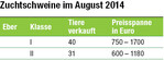 Trotz der verhältnismäßig stabilen Lage auf dem Markt für Schlachtschweine stand die Vermarktung bei den Ferkeln vermehrt unter Druck. Auch beim Verkauf von Zuchtebern ging es im August ruhig zu. Die Nachfrage war im Export ebenfalls verhalten. Weitere Bestellungen für die kommenden Monate liegen jedoch vor. Von den 71 in Baden-Württemberg verkauften Ebern stand die Mehrzahl in Klasse I. Durchschnittspreis: 925 Euro. Eber der Deutschen Landrasse wurden im August nicht gehandelt. Bei der Rasse Piétrain glänzten die Nachkommen der Top-Genetik-Eber Chandi, Tabak, Rasputin und Wadhoch des Züchters Eckhard Weber in Streichental. Sie zeigten hervorragende Bemuskelung bei sehr gutem Wuchs, Fundament und Rahmen und hohe genomische Zuchtwerte....