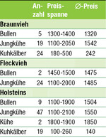 B raunvieh: Angeführt wurde die Kollektion der Bullen von einem Harley-Sohn aus der Zucht von Stefan König, Leutkirch. Er wurde für 1400 Euro verkauft. Ihm folgte ein Vassli-Sohn von Franz Steinhauser, Eberhardzell.Die Jungkühe zeigten enorme Qualität im Exterieur. Heraus stach eine Juleng-Tochter von Robert Schwarz, Argenbühl. Sie beeindruckte mit 34 kg Tagesleistung und war einem Käufer 2050 Euro wert. Mit 1850 Euro folgten eine Vanto-Tochter von der Neuhauser GBR, Dietenheim und eine Tochter des Spietzenbullen Hoxoy aus dem Betrieb Erwin Bühler, Bad Waldsee. Fleckvieh: Beide Bullen fanden einen neuen Besitzer. Körsieger wurde ein Idiom-Sohn von Alois Müller, Atzenreute. Ihm folgte aus dem gleichen Betrieb ein Vlax-Sohn. Teuerste...