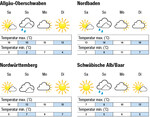 Der Kälteeinbruch hält noch bis Ende der Woche an. Im Allgäu und auf der Alb ist mit Maximaltemperaturen von 7°C bis 10°C zu rechnen. Ab Sonntag steigen die Temperaturen wieder. Lokal steigt das Frostrisiko bis zum Freitag an. Das Wochenende wird bewölkt, mit Niederschlägen am Samstag. Die starken Winde flauen aber ab. Die neue Woche startet mit geringer Bewölkung und sonnigen Abschnitten. Dienstags verdichten sich die Wolken. Zum Ende der Woche lockert die Bewölkung wieder auf, allerdings steigt auch das Niederschlagsrisiko an. In der Region Stuttgart wird ein Temperaturmaximum von 17°C am Dienstag erreicht, welches bis zum Wochenende auf 13°C abfällt. Die Minimalwerte bewegen sich zwischen 7°C und 10°C. Im Rheintal erreichen die...