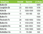 Braunvieh : Die Nachfrage nach Bullen war verhalten. Körsieger war ein Vassli-Sohn aus einer Prossli-Mutter von der Familie Heckenberger, Hochdorf. Bei den Jungkühen erzielte eine Huxoy-Tochter von Martin Riß, Dietmanns, den Tageshöchstpreis von 1650 Euro. Für günstige 1450 Euro konnte der Käufer eine Huxoy-Tochter mit bestem Euter von Martin Hänsler, Deuchelried, erwerben. Viele Jungkühe wechselten zum Anschlagpreis den Besitzer. Den Käufern boten sich günstige Einkaufsmöglichkeiten. Deutlich günstiger als in den Vormonaten mussten erneut die Braunvieh-Zuchtkälber verkauft werden. Fleckvieh: Ein Rauwat-Sohn von Alois Müller, Atzenreute, erzielte 1500 Euro. Er stammte aus einer Seon-Mutter. Im Angebot waren Jungkühe mit guten Leistungen....