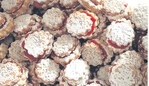 400 g Mehl 200 g Butter 100 g Zucker 1 Vanillezucker 3 Eigelb 50 g Haselnüsse, gemahlen Abrieb 1 Biozitrone 1 Glas Erdbeerkonfitüre Puderzucker