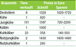 Bei gutem Besuch erwartete die Kaufinteressenten am 4. Dezember ein starkes Angebot an Jungkühen. Aufgetrieben waren zwölf Stiere, eine Kuh, 152 Jungkühe, eine Kalbin und 30 weibliche Zuchtkälber. Vorangestellt bei den Stieren wurde ein Vintage-Sohn. Dieser ging für 1720 Euro nach Baden-Württemberg. Eine breite Auswahl gab es bei den Jungkühen. Den Tageshöchstpreis erhielt mit 2200 Euro eine Brookings-Tochter. Weibliche Zuchtkälber waren sehr gefragt.