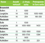 Braunvieh: Angeführt wurde die Kollektion der Bullen von einem Vigor-Sohn aus der Zucht von Konrad Gaum. Reservesieger war ein bestens entwickelter Huxoy Sohn von Familie Heckenberger. Gefragteste Jungkuh war eine Payssli-Tochter aus dem Betrieb Arthur Ulrich aus Essingen. Mit bestem Euter und 32,1 kg Milch erlöste sie 1600 Euro. Die Kuhkälber wurden alle verkauft. Fleckvieh: In den Deckeinsatz wurde ein hornloser Irola-Sohn aus dem Betrieb Alois Müller, Atzenreute verkauft. Die Fleckviehkühe zeigten sich von einer hervorragenden Qualität. Angeführt wurde die Kollektion von jeweils zwei überragenden Töchtern der Bullen Ofir und Rauwat. Aus dem Aufzuchtbetrieb Siegbert Blum kam eine Rauwat-Tochter mit 34 kg Marktgemelk und schaufähigem...