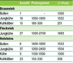 Die RBW-Auktion für Großvieh und Kälber fand am 12. Juli statt. Braunvieh: Körsieger wurde ein Huvi-Sohn aus einer Payssli Tochter mit 3,74 Prozent Eiweiß. Gezüchtet wurde er von der Familie Heckenberger aus Hochdorf. Hochwertig war das Angebot bei den Jungkühen. Es gab gleich sechs Spitzentiere. Zwei Tiere davon kamen aus dem Betrieb Martin Hänsler aus Wangen-Deuchelried. Zum einen eine Valdez-Tochter und eine Anibal-Tochter die mit für 1900 Euro verkauft wurden. Gephard Heim, Tettnang, stellte eine Paykal-Tochter und erlöste für sie 1800 Euro. Für den gleichen Preis wechselte eine Vastin-Tochter aus dem Betrieb Reinhard Schuler aus Ellwangen den Besitzer. Gut verkauft waren die angebotenen Zuchtkälber. Fleckvieh: Ausgezeichnet war die...
