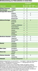 Von den bisher noch nicht bewarnten Gebieten wurde die Schwelle von fünf Prozent jetzt auch im Östlichen Hohenlohe, Odenwald und im Oberen Gäu überschritten. Hier ergeht diese Woche der erste Aufruf zur Kontrolle. Im Rheintal und in der Region Heilbronn/Kraichgau wurde die Schwelle für eine Folgebehandlung überschritten. Liegt dort die erste Behandlung mehr als zwei Wochen zurück und sind jetzt mehr als 15 Prozent der Blätter befallen, ist eine zweite Behandlung angebracht. Bei der Behandlung von Blattkrankheiten ist besondere Sorgfalt geboten, neben den Witterungsbedingungen und der Wasseraufwandmenge ist ein großes Augenmerk auf das Resistenzmanagement zu legen. Wie bekannt ist, gibt es in Österreich und Bayern Regionen mit resistenten...
