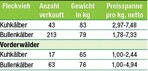 Auf der Versteigerung am 3. August in Donaueschingen bot die RBW 337 Kälber zum Verkauf. Bei weiterhin sehr guter Nachfrage steigerten sich die Preise nochmals .Die 14 Vorderwälder-Kuhkälber waren mit 65 kg relativ leicht. Sie kamen auf 120 Euro. Mit 43 Fleckvieh-Kuhkälbern stand ein starkes Angebot zum Verkauf. Kälberstar war eine Versmold-Tochter vom Betrieb Ewald aus Bräunlingen. Sie ging für stolze 800 Euro ins benachbarte Bayern. Ebenfalls sehr gefragt war eine Monumental-Tochter von der Rogg GbR aus Stühlingen-Bettmaringen. Der Durchschnittspreis lag bei 3,81 Euro pro kg und 316 Euro je Kalb. Die 63 Vorderwälder-Bullenkälber hatten 76 kg Gewicht. Je Kalb wurde netto 296 Euro angelegt. Der Kilopreis steigerte sich somit auf 3,88...