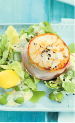 1 großes Bund Basilikum Salz 120 ml Olivenöl 1 große Seite Seelachsfilet (ca. 800 g, ohne Haut und Gräten) 8 Scheiben Speck 1 kleiner Kopfsalat 1/2 Bund glatte Petersilie 100 g Schlagsahne 500 g frische grüne Bohnenkerne 2 Schalotten 1 EL Butter zum Anschwitzen 2 TL Mehl 50 ml Weißwein schwarzer Pfeffer 1 EL Olivenöl