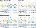 In der Nacht auf Samstag ziehen bei leichtem Wind aus Südwesten dichte Wolken auf, die sich auch tagsüber kaum lösen. In den Höhenlagen ist nachmittags mit Niederschlägen zu rechnen. Die Temperaturen erreichen nur 15 °C im nördlichen Rheintal und im mittleren Neckarraum, 13 °C am Bodensee und 10 °C auf der Alb. Am Sonntag bleibt es meist dicht bewölkt, gebietsweise ist mit Niederschlägen zu rechnen, bei maximal 16 °C im nördlichen Rheintal, im mittleren Neckarraum, 14 °C am Bodensee und 8 °C auf der Alb. Zum Montag dreht der Wind leicht auf Westen und es ist vermehrt mit Niederschlägen zu rechnen, bei Temperaturen bis maximal 15 °C in den Ebenen und 8 °C auf der Alb. Der Dienstag bleibt wechselhaft und kühl. | →Mehr Agrarwetter...