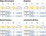 Der Samstag wird nach Auflösung von Nebelfeldern meist sonnig, bei etwas Ostwind. Die Temperaturen erreichen bis 22 °C im nördlichen Rheintal und im mittleren Neckarraum, 20 °C am Bodensee und 17 °C auf der Alb. Die Nachttemperaturen halten sich meist über 12 °C in den Ebenen und 8 °C auf der Alb. Am Sonntag lösen sich die Hochnebelfelder rasch auf, die Sonne hebt die Temperaturen bis 22 °C im nördlichen Rheintal und im mittleren Neckarraum, 20 °C am Bodensee und 13 °C auf der Alb. Am Montag dreht der Wind wieder auf Westen und bringt im Tagesverlauf dichtere Wolken, bei Temperaturen bis maximal 23 °C in den Ebenen und 18 °C auf der Alb. Am Dienstag wechseln dichte Wolken, kurze Aufhellung und in Hochlagen einzelne Schauer. Die Folgetage...