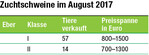 Im Gegensatz zu der weiterhin stabilen Lage bei den Schlachtschweinen und der ausgeglichenen Nachfrage nach Ferkeln ging es im August beim Verkauf von Zuchtebern ziemlich ruhig zu. Die Nachfrage kam vorwiegend von Besamungsstationen, Export und weniger von der Ferkelerzeugung. Es konnten circa 70 Eber von den Züchtern aus Baden-Württemberg verkauft werden. Der größte Anteil war in Klasse I bewertet und hatte den geforderten Index aus der genomischen Typisierung. Der Durchschnittspreis lag bei 1280 Euro. Eber der Deutschen Landrasse wurden im August wiederum nur wenige verkauft. Der Spitzeneber kam aus der Zucht Klaus und Philipp Benz in Bingen. Der Calisto-Sohn hatte eine sehr gute äußere Erscheinung, gute Bemuskelung und eine...