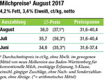 Die Milchpreise sind im August 2017 gegenüber dem Vormonat weiter gestiegen. Der BWagrar-Monatspreis kletterte im gewogenen Mittel um 0,35 Cent auf 36 Cent pro kg im August. Der Bio-Milchpreis blieb mit 49,4 Cent pro kg auf dem Niveau des Vormonats. Der Kieler Rohstoffwert stieg im August zum vierten Mal in Folge auf 40,8 Cent, im Apri dieses Jahres lag er noch bei 29,8 Cent. Trotz dieses Anstiegs klafft die Schere bei den Verwertungen für Eiweiß und Fett weiter stark auseinander. Fett erreicht weiterhin Höchstpreise, Pulver verharrt auf einem niedrigen Preisniveau. Die Milchanlieferung in Deutschland war um den Monatswechsel August/September zwar saisonal rückläufig. Sie liegt aber wieder deutlicher über dem Vorjahresniveau, so die ZMB....