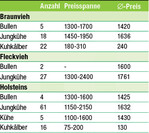 Die Nachfrage nach Zuchtvieh auf der RBW-Auktion am 13. September war groß. Braunvieh: Ein von Jürgen Held, Donaustetten, gezüchteter Anibay-Sohn wurde Körsieger bei den Bullen. Er erlöste 1700 Euro. Auch der Reservesieger, ein Auranto-Sohn von Helmut Schöllhorn, Ummendorf, war gefragt. Bei den Jungkühen stellte Edwin Kling, Murrwangen, gleich drei Spitzentiere. Gefragteste Jungkuh war eine Himalaya-Tochter mit 30 kg Milch. Sie war einem Käufer 1950 Euro wert. Fleckvieh: Bei den Bullen stellte Alois Müller, Atzenreute, zwei Tiere zum Verkauf: ein Manton-Sohn aus einer Safhon-Mutter, der Körsieger wurde sowie ein Othello-Sohn aus einer Safdy-Mutter. Bei den Jungkühen erlöste eine frisch gekalbte Manor-Tochter von Alfred Berger,...