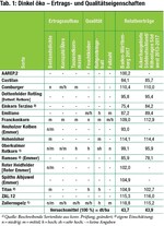 Der Ertrag liegt im Mittel der Standorte bei 43,7 dt/ha, das sind zehn Prozent mehr als im Vorjahr. An den einzelnen Orten bewegte sich der Ertrag zwischen 34,7 und 48,7 dt/ha. Ertragsstärkste Sorte war Zollernspelz (51,9 dt/ha), dicht gefolgt von dem Schweizer Zuchtstamm ZAL.12 (50,4 dt/ha). Über dem Durchschnitt mit relativen 105 Prozent lag die neue Emmersorte Späths Albjuwel. Gelbrostbefall machte den Emmersorten vor allem in Hohenheim zu schaffen, Am Standort Karlsruhe-Grötzingen wurde ein hoher Braunrostbefall festgestellt und die langstrohigen Sorten gingen durchweg ins Lager. Die Verrechnung über die letzten fünf Jahre (2013 bis 2017) bezieht sich auf das Anbaugebiet Süddeutschland/Höhenlage Südwest mit vier badenwürttembergischen...