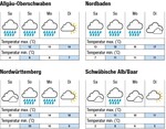 Der Samstag beginnt im Osten noch teils sonnig, dann bringt auffrischender Wind aus Westen teilweise dichte Wolken. Die Temperaturen steigen tagsüber auf maximal 13°C im nördlichen Rheintal, 12°C im mittleren Neckarraum und am Bodensee und 9°C auf der Alb. In der Nacht auf Sonntag setzt verbreitet Regen ein, der im Verlauf des Tages nach Osten abzieht bei Temperaturen bis 15°C im nördlichen Rheintal, 13°C im Hohenlohischen und am Bodensee und 10°C auf der Alb. Der Montag wird bedeckt und voraussichtlich trocken bei Temperaturen um 14°C in den Ebenen und 10°C auf der Alb. Zum Dienstag lösen sich die Wolken zunehmend bei leicht steigenden Temperaturen. In den Folgetagen wird es freundlicher bei etwa gleichbleibenden Temperaturen. |...