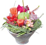 Material: Wasserundurchlässiger Topf mit Steckschwamm Und so wird es gemacht: 1. Aus Gräsern wird passend zum Gefäß ein kleiner Kranz geformt. Er gibt uns einen perfekten Abschluss und es muss fast kein Schwamm mehr abgedeckt werden. | 2. Die Mitte mit einigen Blättern und etwas Moos abdecken. | 3. Anschließend zuerst den Apfel mit einem Zahnstocher anpieksen und in der Mitte platzieren. | 4. Hagebutten, Physalis, und Erika sowie einige Blüten aus dem Garten um den Apfel herum in den Schwamm stecken. Und schon ist das Beerengesteck fertig!