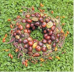Material: Strohrömer, Wickeldraht, Zahnstocher, Moos, Kastanien, Clematisranken, Hagebuttenranken, Erika und Physalis. Und so wird es gemacht: 1. Ein Strohrömer wird rundum mit Stroh umwickelt. Hierfür wird das Moos aufgelegt und mit Wickeldraht fixiert. | 2. Anschließend bereitet man sich jede Menge Kastanien vor. | 3. Diese werden mit einem spitzen Messer angepiekst und auf einen Zahnstocher gesteckt. | 4. Dann werden nach und nach die Kastanien sowie deren Schale auf die umwickelte Unterlage gesteckt. Es erfordert schon etwas Geduld, denn je nach Größe der Strohunterlage werden doch einige Kastanien benötigt. | 5. Anschließend formt man aus wilder Clematis einen etwas größeren Ring. | 6. Der fertige Kranz wird dann auf den Clematisring...