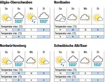 Der Samstag beginnt frostfrei und sonnig. Die Temperaturen erreichen bis 17°C im nördlichen Rheintal, im mittleren Neckarraum und am Bodensee und bis 14°C auf der Alb. Dann bringt böigfrischer Wind aus Südwesten Wolken und teils ergiebigen Regen, der auch am Sonntag anhält. Die Temperaturen im nördlichen Rheintal, im mittleren Neckarraum und am Bodensee fallen auf 11°C und auf 7°C auf der Alb. Die Schneefallgrenze sinkt teils unter 1000 Meter Höhe. In der Nacht zum Montag gibt es in Höhenlagen verbreitet Frost, bei klarem Himmel auch in den Ebenen Bodenfrost. Tagsüber lockert sich die Bewölkung mit nachlassendem Wind aus Westen und es bleibt kühl bei maximal 10°C in den Ebenen und 5°C auf der Alb. Die Folgetage werden leicht wechselhaft...