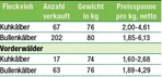 Am 2. November konnte die RBW in Donaueschingen 349 Kälber anbieten und komplett verkaufen. Bei weiter guter Nachfrage und insgesamt guter Kälberqualität kamen die Gebote flott. Die 17 Vorderwälder-Kuhkälber erzielten im Schnitt 149 Euro bei 74 kg Gewicht. Die 67 Fleckvieh-Kuhkälber boten eine breite Auswahl und wechselten sehr flott ihre Besitzer. Der Durchschnittspreis lag bei 3,45 Euro pro kg und 261 Euro je Kalb. Die 63 Vorderwälder-Bullenkälber wogen im Schnitt 76 kg. Je Kalb wurde netto 251 Euro angelegt. Der kg-Preis lag bei 3,29 Euro. Preisabschläge gab es für leichte Kälber unter 65 kg. Die 202 Fleckvieh-Bullenkälber kamen auf 432 Euro je Kalb bei 80 kg Gewicht oder 5,40 Euro pro kg. Junge gut entwickelte Kälber erzielten Preise...