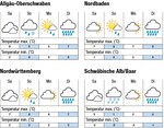 Der Samstag beginnt in den Ebenen bedeckt und meist frostfrei. In Hochlagen sinken die Temperaturen bei klarem Himmel bis - 4 °C. Tags lockert sich die Bewölkung nur zeitweise, die Temperaturen erreichen 7 °C im nördlichen Rheintal, im mittleren Neckarraum, am Bodensee und bis 3 °C auf der Alb. Dann bringt böigfrischer Westwind zunehmend dichte Wolken und nachts Regenschauer, die oberhalb von 400 Metern zunehmend in Schnee übergehen. Am Sonntag weht der Westwind böig-frisch. Die Schauer ziehen ab und die Wolken lockern sich bei Temperaturen bis 8 °C in den Ebenen und 1 °C auf der Alb. In der Nacht zum Montag gibt es ab den mittleren Lagen verbreitet Frost, tagsüber löst sich die Bewölkung zeitweise bei abnehmendem Wind aus Westen und...