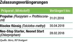 Das Bundesamt für Verbraucherschutz und Lebensmittelsicherheit (BVL) hat die Zulassung von Pflanzenschutzmitteln, deren Zulassung durch Zeitablauf endete, verlängert. Diese Zulassungsverlängerungen werden bis zur endgültigen Entscheidung über eine erneute Zulassung erteilt. →Aktuelle Pflanzenschutzmeldungen und Änderungen in den Zulassungen von Pflanzenschutzmitteln können Sie immer ab montags auf www.bwagrar.de unter der Rubrik Pflanzenbau nachlesen. Die Meldungen erhalten Sie auch über unsere kostenlosen Newsletter Ackerbau (wöchentlich) und Sonderkulturen (vierwöchentlich). Melden Sie sich gleich an.