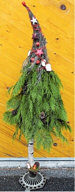 Material: Hasensdraht, Koniferenzweige, Moos, Zapfen, sonstiges Weihnachtszubehör, Ständer, Stock Und so wird es gemacht: 1. Für das Tannenbäumchen wird ein circa 60 cm langes Stück Hasendraht abgeschnitten, zur Tüte gerollt und so nach innen gebogen, dass eine relativ gerade Form entsteht. Sie kann, je nach Wunsch schmaler oder breiter gestaltet werden. | 2. Die Drahttüte wird auf dem Stock, welcher vorher auf dem Ständer befestigt wird, aufgesteckt. | 3. Anschließend den Wickeldraht an der unteren Stelle befestigen, einmal um den Ast führen und auf der anderen Seite wieder an der Hasendrahttüte festdrehen. Dies in beide Richtungen durchführen, damit die Tüte nicht mehr schaukelt. | 4. Anschließend wird das Drahtgerüst komplett mit Moos...