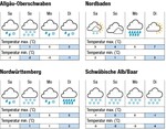 Am Samstag bringt frischer Westwind einen Wechsel von kurzen Aufhellungen, Wolken und Schauern. Die Schneefallgrenze steigt im Süden bis 500 Meter Höhe und die Temperaturen erreichen bis 5°C in den Ebenen und -1°C auf der Alb. Am Sonntag fallen zeitweise Schauer, meist als Schnee bei mässigem Westwind und Temperaturen bis 4°C in den Ebenen und 0°C auf der Alb. Am Montag gibt es verbreitet Nachtfrost. Tagsüber bringt dichte Bewölkung weitere Schauer bei zunehmendem Wind aus westlichen Richtungen und maximal 5°C in den Ebenen und 0°C auf der Alb. Am Dienstag nimmt der Wind voraussichtlich ab und dreht auf Nord, die Bewölkung lockert sich langsam und die Temperaturen erreichen bis 7°C in den Ebenen und -1°C auf der Alb. In den Folgetagen ist...