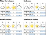 Der Samstag beginnt mit Frost in höheren Lagen, frischer Wind aus Westen lockert die Bewölkung in den Hochlagen. Die Temperaturen erreichen 7 °C in den Ebenen und 4 °C auf der Alb. Am Sonntag bleibt es in den Ebenen frostfrei bei meist dichtem Hochnebel und Wind aus West. In Hochlagen scheint die Sonne, bei Temperaturen bis 8 °C in den Ebenen und 6 °C auf der Alb. Am Montag lockert starker bis stürmischer Wind aus Südwesten die Wolken auf. Die Temperaturen erreichen um 10 °C in den Ebenen und 7 °C auf der Alb. Dann ziehen dichte Wolken auf und bringen Schauer, die in Hochlagen in Schnee übergehen. Am Dienstag bringt starker Wind aus westlichen Richtungen einen Wechsel von kurzen Aufhellungen, Wolken und Schauern. Die Temperaturen...