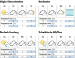 Der Samstag beginnt mit Regenschauern und frostfrei. Tagsüber ist es vor allem im Norden bewölkt. Der Wind legt sich und dreht im Tagesverlauf auf Ost, die Temperaturen erreichen bis 10°C im Rheintal und 7°C auf der Alb. Die Nacht auf Sonntag bleibt frostfrei. Tagsüber bleibt es dann dicht bewölkt bei frischem Ostwind sowie maximal 8°C im Rheintal und 4°C auf der Alb. Am Montag gibt es voraussichtlich bis in tiefere Lagen leichten Frost. Tagsüber lockert der frische Ostwind die Wolken auf. Die Temperaturen erreichen bis 5°C im Allgäu und 2°C auf der Alb, dann dreht der Wind auf Süd. Der Dienstag beginnt mit leichtem Frost in höheren Lagen. Tagsüber wird es meist dicht bewölkt sein bei meist schwachem Wind sowie maximal 7°C in den Ebenen...