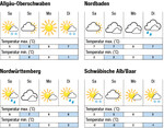 Der Samstag beginnt gebietsweise mit Schauern. In den Hochlagen gibt es Schnee und in den Ebenen bilden sich Hochnebelfelder. Es herrscht leichter Wind aus nördlichen Richtungen bei maximal 7°C in den Ebenen und 2°C auf der Alb, wo meist die Sonne scheint. Am Sonntag löst leichter Südwestwind die Hochnebelfelder meist auf. Die Sonne scheint durch höhere Wolken und hebt die Temperaturen bis 7°C in den Ebenen und 5°C auf der Alb. Der Montag wird in den Ebenen bewölkt, in Hochlagen meist sonnig bei maximal 9°C im Rheintal, am Bodensee und auf der Alb. Am Dienstag bringt zunehmender Wind von Westen Wolken, maximal 7°C in den Ebenen und 5°C auf der Alb, abends Regen und Schnee in Hochlagen. Die Folgetage werden wechselhaft und kälter. |...