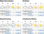 Der Samstag ist meist bewölkt. In Hochlagen sind einige Schneeschauer möglich, bei zeitweise frischem Wind aus westlichen bis nördlichen Richtungen mit maximal 5°C im Rheintal, 3°C am Bodensee und 0°C auf der Alb. Nachts gibt es klare Abschnitte und Frost. Am Sonntag bringt frischer Westwind dichte Wolken und nachmittags Schauer, die in höheren Lagen als Schnee fallen, bei maximal 5°C in den Ebenen und 1°C auf der Alb. Am Montag nehmen Wind und Bewölkung ab, bei maximal 4°C im Rheintal, 2°C am Bodensee und -2°C auf der Alb. Am Dienstag liegen die Ebenen teils unter Hochnebel, in Hochlagen scheint meist die Sonne bei maximal 4°C in den Ebenen und -2°C auf der Alb. Bis Freitag ist mit wenig Veränderung zu rechnen und leicht zunehmenden...