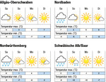 In der Nacht zum Samstag zieht eine Kaltfront aus Nordosten auf, die dichte Bewölkung und frostige Temperaturen bringt. Tagsüber bleibt es weitgehend bedeckt, vereinzelt sind Niederschläge möglich. Die Temperaturen erreichen tagsüber 1°C im nördlichen Rheintal und im mittleren Neckarraum und -3°C auf der Alb. Zum Sonntag weiter Nachtfröste, im Laufe des Tages löst sich die Bewölkung zunehmend bei böigem Ost-Wind. Die Temperaturen bleiben weitgehend frostig und erreichen 1°C im nördlichen Rheintal und im mittleren Neckarraum und -3°C auf der Alb. Am Montag zunächst Nachtfrost, tagsüber wird es weitgehend freundlich bei teils stürmischen Böen aus Osten und Temperaturen um 5°C in den Ebenen und -2°C auf der Alb. Ab Dienstag milder und weiter...