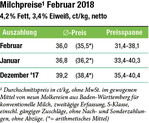 Der BWagrar-Milchpreis ist im Februar gegenüber Januar um 0,8 Cent gefallen. Er liegt jetzt bei 36,0 Cent pro kg Cent gewichtet. Der Bio-Milchpreis blieb im Februar mit 49,8 Cent pro kg wie gewohnt stabil. Der deutliche Preisrückgang bei der konventionell erzeugten Milch zu Jahresbeginn wurde im Februar gebremst. Grund dafür sind die relativ stabilen Fettpreise. Auch der Absturz bei den Käsepreisen ist zum Stillstand gekommen, wobei die Notierungen hier weiterhin deutlich unter dem Niveau vom Herbst 2017 liegen. Seit März 2018 sind die Erlöse für Schnittkäse wieder gestiegen. Ebenso bei Butter: Nachdem ein 250-g-Päckchen im Februar im Aldi noch 1,29 Euro kostete, liegt der Preis seit dem 1. März bei 1,59 Euro. Nach wie vor schwierig ist...