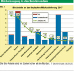Die Milchkrise 2015/16 mit Preisunterschieden bis zu 21,5 ct/kg zwischen konventioneller Milch und Biomilch hat viele Milcherzeuger veranlasst, ihre Produktion auf ökologische Erzeugung umzustellen. Dazu trugen auch die seit 2014 ausgesprochen stabilen Preise mit einem Niveau von 48 bis 49 ct/kg bei. Entsprechend steigen die Biomilch-Mengen bereits seit dem Jahr 2014 stärker an. Im Jahr 2017 hat sich der Anstieg, verzögert durch die Umstellungszeiten, deutlich beschleunigt. Deutschlandweit wurden im vergangenen Jahr 939 Millionen kg Biomilch an Molkereien geliefert (+18 Prozent gegenüber dem Jahr 2016). Dabei hat sich der Anstieg im Laufe des Jahres beschleunigt. Im Dezember 2017 wurden fast 32 Prozent mehr Biomilch geliefert als im...