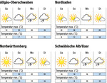 Der Samstag beginnt meist klar bei leichtem Wind aus südlichen Richtungen. Die Sonne löst einzelne Nebelfelder rasch auf und hebt die Temperaturen auf 22°C im nördlichen Rheintal, 20°C im mittleren Neckarraum, 18°C am Bodensee und 16°C auf der Alb. Am Sonntag steigen die Temperaturen weiter auf sommerliche 26°C im nördlichen Rheintal, 24°C im mittleren Neckarraum und 18°C auf der Alb, die Sonne wird gelegentlich von hohen Wolken verdeckt. Zum Montag ziehen mit zunehmendem Westwind neue Wolken auf, bringt Temperaturen bis 20°C in den Ebenen und 16°C auf der Alb, und gegen Abend gebietsweise Gewitter. Am Dienstag wird es sonnig mit leichter Bewölkung, gegen Nachmittag steigt das Gewitterrisiko. Die Folgetage werden voraussichtlich sonnig...