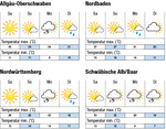 Am Samstag löst die Sonne einzelne Hochnebelfelder rasch auf und hebt die Temperaturen auf 27 °C im nördlichen Rheintal, im mittleren Neckarraum, 25 °C am Bodensee und 23 °C auf der Alb. Der Sonntag beginnt meist sonnig, die Temperaturen erreichen ähnliche Werte wie am Samstag, im Tagesverlauf bilden sich Quellwolken und abends vor allem in Hochlagen Gewitter. Am Montag bringt auffrischender Westwind zunehmend teils gewittrige Schauer bei maximal 22 °C im nördlichen Rheintal, im mittleren Neckarraum, 24 °C am Bodensee und 20 °C auf der Alb. Am Dienstag lockert mässig-böiger Wind aus westlichen Richtungen die Bewölkung zeitweise, vor allem in Hochlagen fallen Schauer, bei maximal 20 °C in den Ebenen und 16 °C auf der Alb.Die Folgetage...