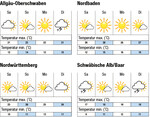 Am Samstag ist zunächst gebietsweise mit Nebel zu rechnen, der sich im Laufe des Tages löst. Tagsüber wird es sonnig bei vereinzelten Wolken und mäßigem Wind aus nordöstlichen Richtungen. Die Temperaturen steigen auf 26°C im nördlichen Rheintal, 24°C im mittleren Neckarraum und 16°C auf der Alb. In der Nacht auf Sonntag bilden sich lokale Nebelfelder, die sich im Laufe des Tages lösen. Der Wind dreht auf Osten und die Temperaturen steigen auf sommerliche 27°C im nördlichen Rheintal, 26°C im mittleren Neckarraum und 19°C auf der Alb, bei weitgehendem Sonnenschein. Am Montag bleibt es sonnig und warm bei Temperaturen bis 27°C in den Ebenen und 18°C auf der Alb. Zum Dienstag ziehen mit Wind aus Norden dichte Wolken auf, die stellenweise für...